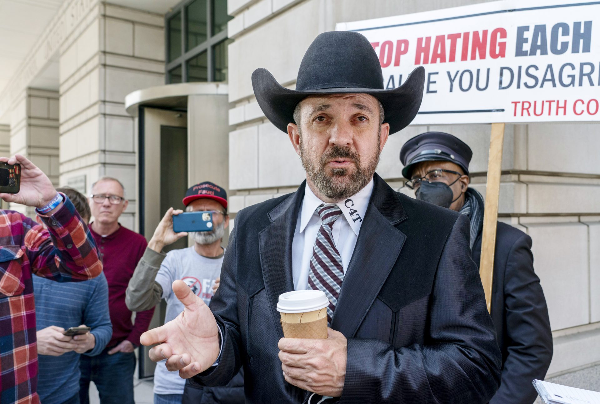 'Cowboys for Trump' founder's Jan. 6 case highlights challenges... In this May 13, 2021, photo Couy Griffin presides at a public meeting in Alamogordo, N.M., in a shirt with a "C4T" logo that stands for Cowboys for Trump. | Morgan Lee/AP Photo.